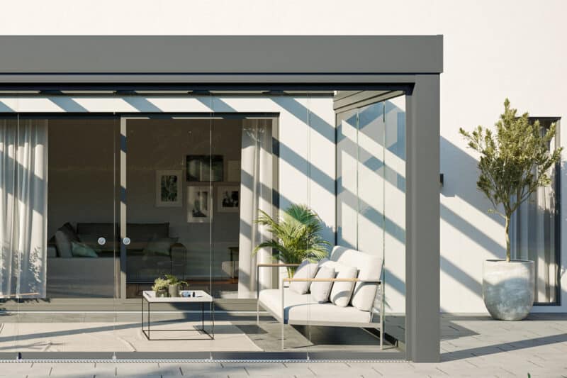 The roof is designed to be integrated with the SF20 frameless sliding door or SF25, SF30 or SF35 slide and turn door system underneath. These non-thermally broken systems combine with the roof to create a comfortable living space in your garden, perfect for longer use throughout the year.