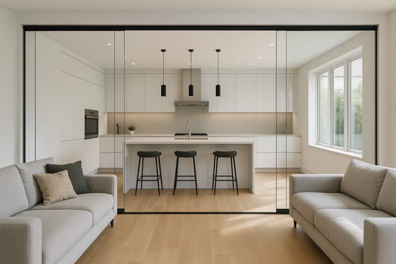 A subtle bottom track only 11mm deep can be recessed into the floor for a flush finish. The sliding option provides wider panels; as they stay in the track, this does not encroach into either room. Extended track available which would provide a 100% clear opening.