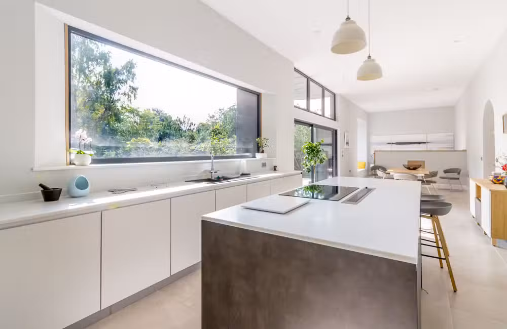 The design features two innovative fixed frame aluminium windows, in the kitchen a large fixed frame window over the sink perfectly frames the view out over the garden, whilst at the other end of the extension a large picture window and stylish window seat overlook the mature landscaping.