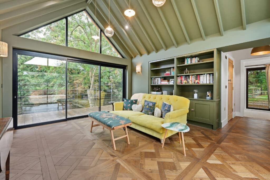 The result is a bright, contemporary family hub with panoramic views, all set against the backdrop of mature trees and the lake. The new extension and SUNFLEX UK glazing maximise views across this remarkable setting, ensuring the landscape remains central to everyday living.