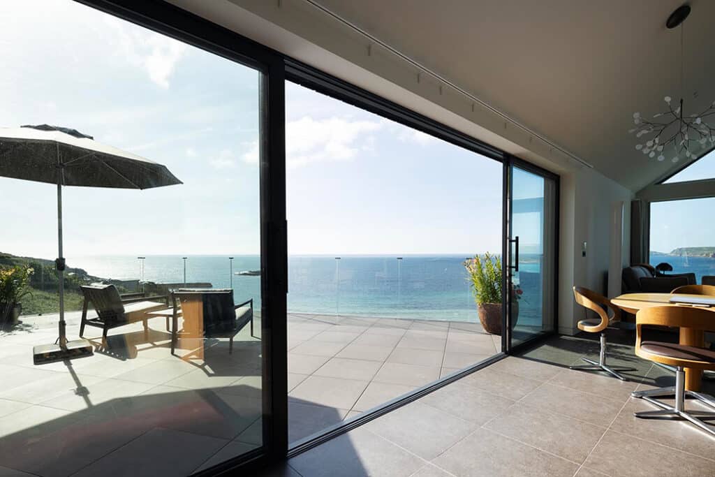 On the upper floor two sets of slim-framed SVG30 sliding doors connect the living space to the stunning terrace. The larger 4-panel, centre opening set provides the connection between the kitchen and living room, whilst a smaller 2-panel set provides the study with its own views out to sea. On the lower ground floor the master-bedroom gets its own set of doors as the SVG30 is designed in a stunning open-corner sliding door configuration to allow for panoramic views; whilst the remaining bedrooms feature a combination of sliding doors incorporating Juliet balconies, fixed frame windows and sliding windows.